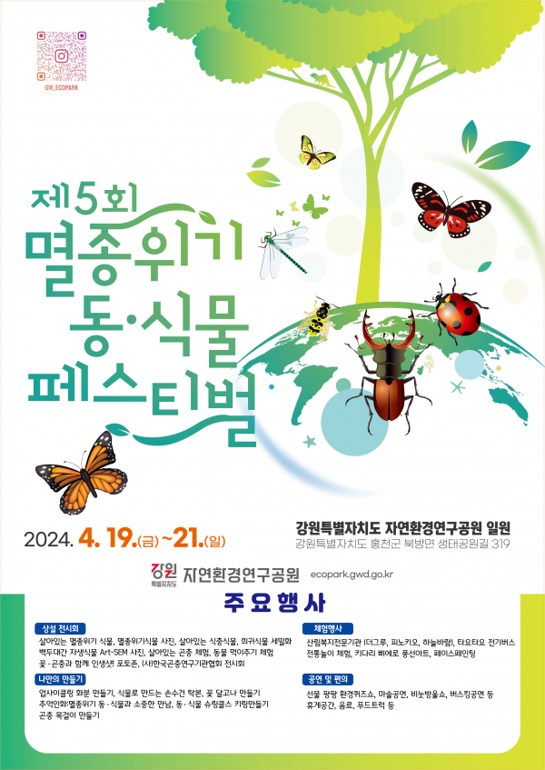 [AANEWS] 강원특별자치도 자연환경연구공원은‘제5회 멸종위기 동·식물 페스티벌’을 4월 19일부터 21일까지 총 3일간 자연환경연구공원에서 개최한다고 밝혔다.