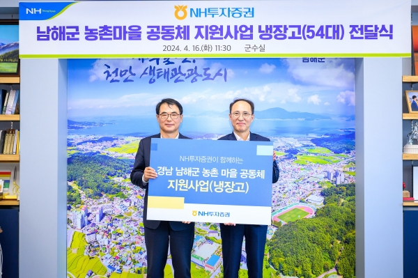 이날 냉장고 기탁식을 위해 남해군을 찾은 NH투자증권 김용기 부사장은 “NH투자증권은 다양한 사회공헌 사업을 지원하고 있으며 그중 농촌마을 공동체 지원사업을 통해 매년 6곳의 군 지부를 선정해 냉장고를 기부하고 있다”며 “냉장고 기부를 통해 남해군민들에게 도움이 되었으면 하고 앞으로도 농촌과 상생방안을 고민하며 사회에 긍정적인 영향력을 끼칠 수 있는 NH투자증권이 되도록 노력하겠다”고 말했다.