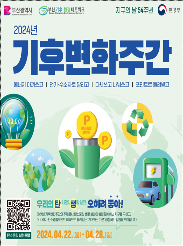 [AANEWS] 부산시는 '제54주년 지구의 날'을 맞아 오는 22일부터 28일까지를 '제16회 기후변화주간'으로 정하고 이 기간 '우리의 탄소중립 생활 실천, 오히려 좋아'를 주제로 다채로운 기념행사를 개최한다고 밝혔다.