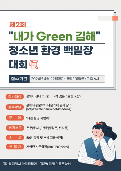 [AANEWS] 김해시는 환경의 날을 기념해 환경의 중요성을 알리고 더 나은 지구환경 만들기를 위해 제2회 ‘내가 Green 김해’ 청소년 환경 백일장을 개최한다고 18일 밝혔다.