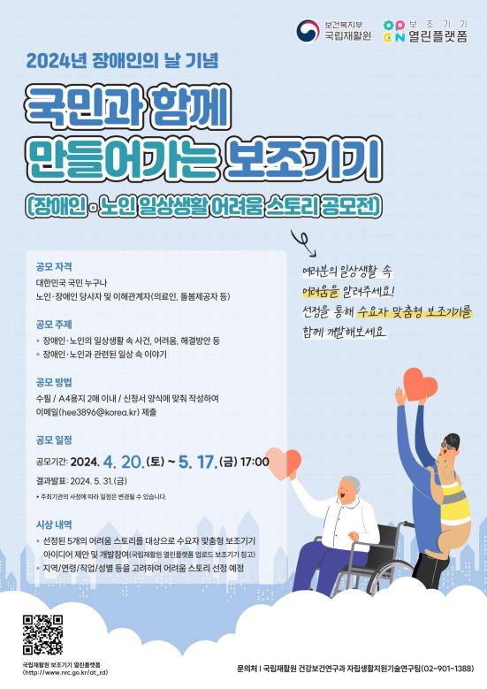 [AANEWS] 보건복지부 국립재활원은 장애인의 날을 기념해 지역사회 장애인·노인을 대상으로 수요자 중심의 보조기기 서비스를 제공하기 위해‘2024년 장애인·노인 일상생활 어려움 스토리 공모전’을 4월 20일부터 5월 17일까지 개최한다고 밝혔다.