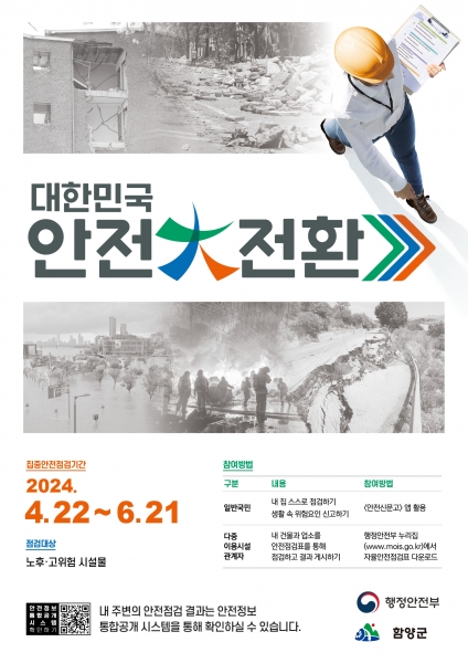 [AANEWS] 함양군은 오는 22일부터 6월 21일까지 61일간 지역 내 안전취약시설 90개소를 대상으로 ‘대한민국 안전대전환 2024년 집중안전점검’을 추진한다.