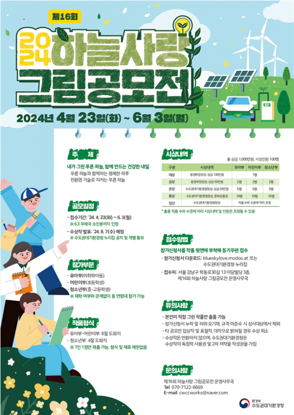 접수처: 서울특별시 강남구 학동로30길 13 3층, 제16회 하늘사랑 그림공모전 운영사무국 수도권대기환경청은 제출된 작품의 주제 적합성, 독창성, 회화성 등을 기준으로 전문가 심사를 거쳐 총 100여 점의 수상작을 8월 7일 수도권대기환경청 누리집을 통해 공개할 예정이다.