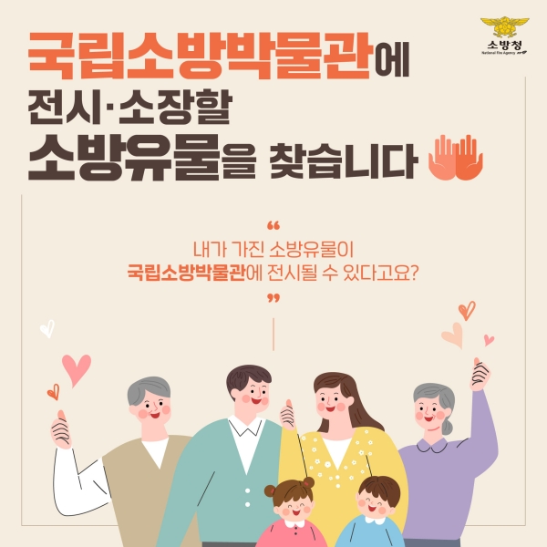국립소방박물관: 소방유물의 보존 및 전시 연구 목적으로 경기도 광명시 건립 예정 소방유물 수집·기증 운동은 소방과 관련한 역사 자료 또는 유물을 찾아 우리나라 소방의 역사를 재조명하고 박물관 전시·관람을 통한 안전 문화 확산을 위해 마련됐다.