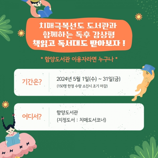 치매극복도서 독후 감상평 행사와 관련한 자세한 내용은 함양군 치매안심센터로 문의하면 된다.