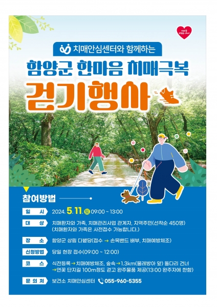 [AANEWS] 함양군보건소는 오는 5월 11일 상림공원 일원에서 치매인식개선과 사회적 공감대 확산을 위한 ‘2024년 함양군 한마음 치매극복 걷기행사’를 개최한다.