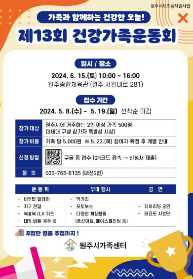 ‘제13회 건강가족운동회’는 6월 15일 10시 원주종합체육관에서 개최한다.