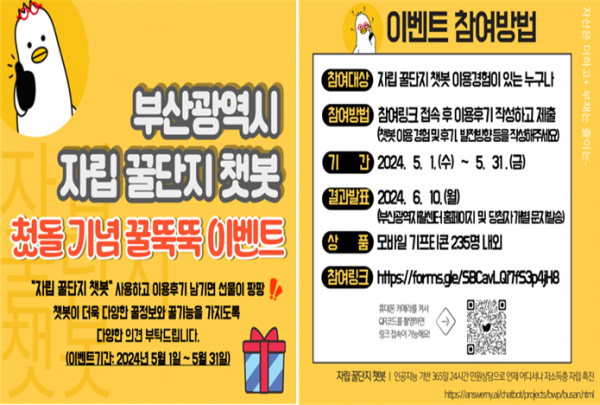 한편 시와 부산광역자활센터에서는 ‘자립 꿀단지’챗봇 탄생 1주년 홍보 및 챗봇 고도화를 위한 시민 의견을 수렴코자, 5월 한 달간 '‘자립 꿀단지’ 첫돌 기념 꿀뚝뚝 이벤트'를 실시한다.