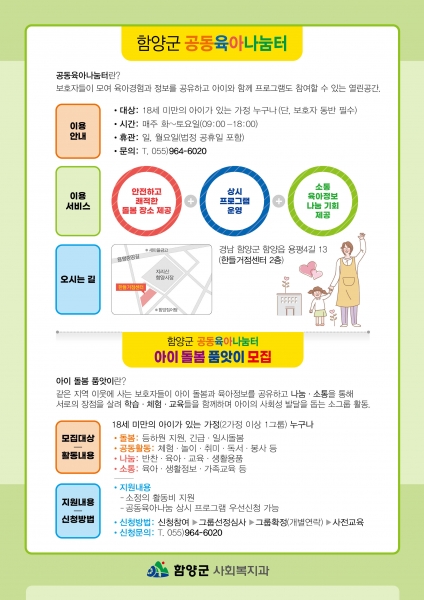 [AANEWS] 함양군은 4월 30일부터 함양군 공동육아나눔터를 한들거점센터 2층에서 운영한다고 밝혔다.