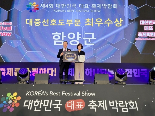 함양군은 이번 대한민국 대표 축제박람회에 참가해 현장 관람객들로부터 가장 많은 인기를 얻어 ‘대중선호도 부문’에서 최우수상을 수상했다.