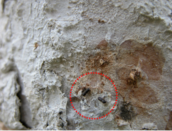 주로 주간에 구멍을 뚫고 들어가 침입 구멍으로 톱밥과 같은 가루가 나온다.