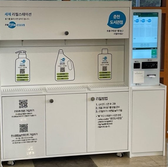 [AANEWS] “다 쓴 세제 용기, 버리지 말고 친환경 세제 담으세요” 춘천시가 쓰레기 없애기 실천 확산을 위해 춘천시립도서관 1층 북카페에 친환경 세제 무인 충전 장비를 설치했다고 2일 밝혔다.