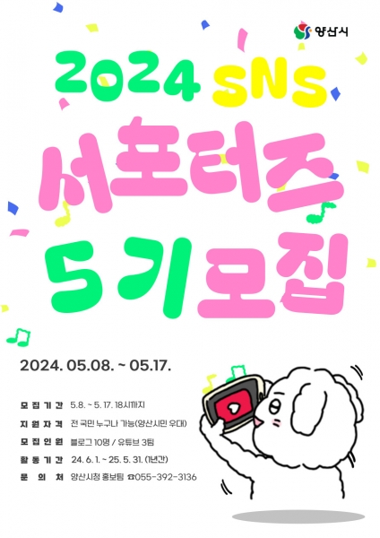 [AANEWS] 양산시는 SNS를 활용해 시정을 홍보하고 시민과 소통하는 메신저 역할을 수행할 ‘양산시 SNS 서포터즈 5기’를 오는 8일부터 17일까지 모집한다고 밝혔다.