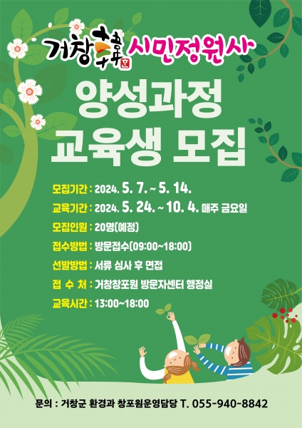 접수는 거창창포원 행정실에 방문해 신청할 수 있으며 교육생은 1차 서류심사, 2차 면접을 거쳐 선발된다.