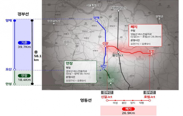 그간 경찰청은 경기남부·충청권의 출·퇴근 버스 증가로 연장 필요성이 제기된 ‘평일 경부선 전용차로’와, 실효성 등으로 민원이 지속 제기된 ‘주말 영동선 전용차로’에 대해 국토교통부·한국도로공사·버스단체·시민단체와 협의체를 구성해 논의했으며 버스 교통량과 민원현황 등을 바탕으로 위와 같은 개정안을 마련해왔다.