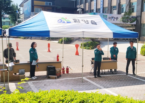 이어 함양소방서 현장대응단의 주도로 소화기 사용에 대한 시범과 직원들 실습에 이어 제8962부대 3대대 주도로 방독면 착용 교육 및 시범 착용을 통해 스스로를 지키는 생존훈련의 중요성도 배울 수 있었다.