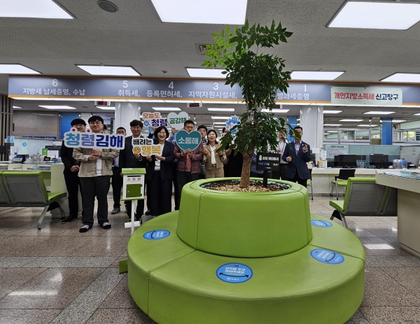 또한 세무민원실 내 해피트리 나무를 청렴수로 지정하고 “청렴 세정을 약속한다”라는 문구를 새긴 청렴팻말을 설치했으며 민원인과의 소통을 더욱 강화하기 위해 청렴소통함을 비치했다.