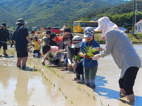 이날 체험활동에는 이동초등학교 전교생을 비롯한 50여명이 참여했으며 참가자들은 직접 못줄을 잡고 모를 심어보는 체험을 했다.