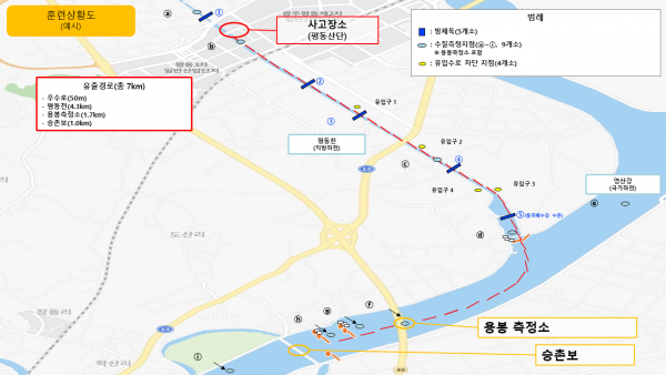 이번 방제훈련은 영산강 수계 내 산업단지 공장에서 화학물질과 기름이 영산강 본류에 유출되고 물고기가 폐사하는 등 재난상황을 가정해 진행된다.