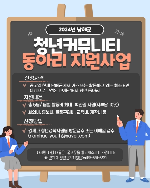 [아시아월드뉴스] 남해군은 청년들의 활발한 문화 활동과 능력개발에 도움을 주기 위해 ‘청년 커뮤니티 동아리 지원사업’ 참여자를 모집한다고 밝혔다.