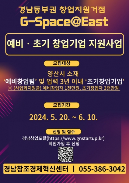 [아시아월드뉴스] 양산시는 동부 경남 창업지원 거점인 G-스페이스 동부에서 ‘2024년 예비·초기창업기업 지원사업’에 참여할 예비창업팀 및 초기창업기업을 모집한다고 밝혔다.