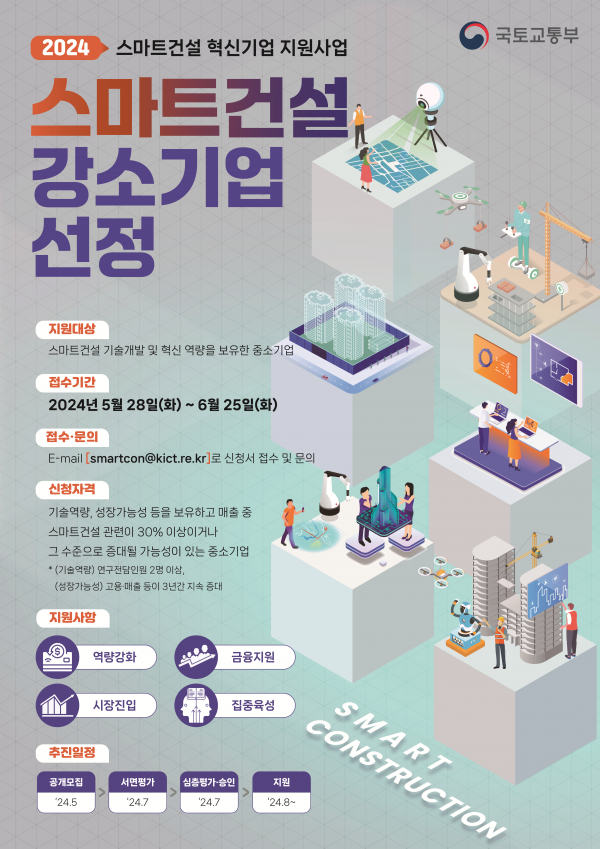 [아시아월드뉴스] 국토교통부는 스마트건설 기술개발 역량을 보유하고 있는 등 성장잠재력이 큰 중소기업들을 대상으로 5월 28일부터 4주간 스마트건설 강소기업을 모집한다.