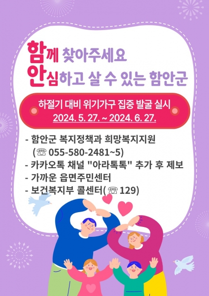 주변에 도움을 필요한 이웃이 있다면 가까운 읍면사무소나 보건복지상담센터, 함안군 카카오톡 신고 채널 ‘아라톡톡’으로 도움을 요청하면 된다.