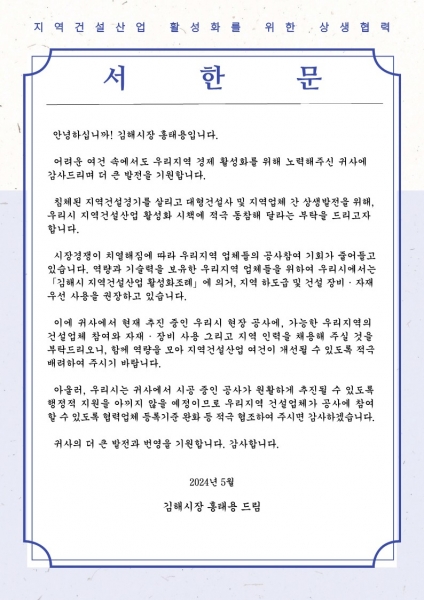 홍시장은 서한문에서 “역량과 기술력을 보유한 우리 지역업체들이 시장에서 퇴출되지 않도록 현재 추진 중인 사업에 가능한 우리 지역의 건설업체 참여와 지역 자재· 장비 우선사용 그리고 지역 인력을 채용해 주실 것을 부탁드린다”며 함께 역량을 모아 지역건설산업 여건이 개선될 수 있도록 적극적인 배려를 부탁했다.