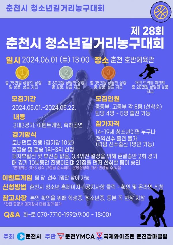 [아시아월드뉴스] “호반체육관에서 청소년들의 멋진 농구 경기 관람하세요” 춘천시가 주최하고 춘천YMCA, 국제와이즈멘 춘천감마클럽이 공동 주관하는 제28회 춘천시 청소년 길거리 농구대회가 오는 6월 1일 오후 1시 춘천 호반체육관에서 펼쳐진다.