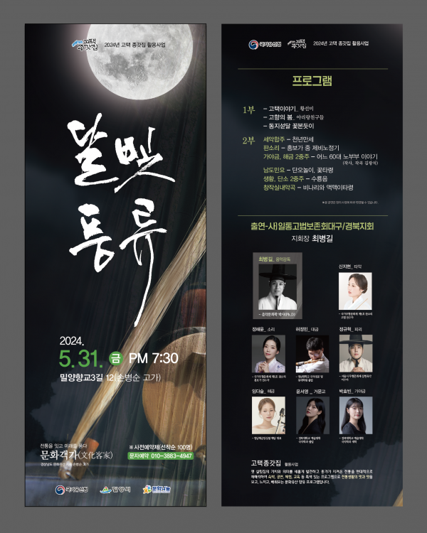 [아시아월드뉴스] 밀양시는 오는 31일 오후 7시 30분 교동 밀양향교3길 12 손병순 고가에서‘2024년 고택 종갓집 활용사업’의 일환으로 달빛 풍류 공연이 펼쳐진다고 밝혔다.