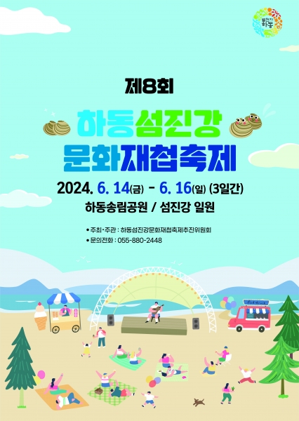 6월 14일~16일 송림공원과 인근 섬진강 변에서 개최되는 재첩축제는 다양한 먹거리와 볼거리, 즐길 거리로 하동의 재첩 문화를 온전히 맛보고 즐길 수 있는 하동의 대표적인 축제이다.