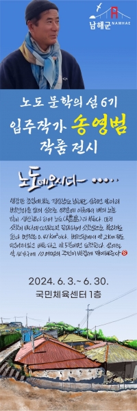 [아시아월드뉴스] 남해군은 6월 3일부터 6월 30일까지 국민체육센터 1층 로비에서 ‘노도 문학의 섬 6기 입주작가’ 송영범 씨가 ‘노도에 오시다’라는 주제로 펜화그림 및 캘리그라피 작품 66점을 전시한다고 밝혔다.