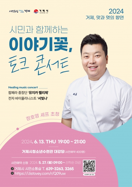 [아시아월드뉴스] 거제시 주최로 오는 13일 최고의 일식요리 연구가 정호영 쉐프를 초청해 개최되는 2024 토크콘서트 시민과 함께하는 이야기꽃이 사전예약 시작 2일 만에 전석 마감되는 등 시민들의 관심이 뜨겁다.
