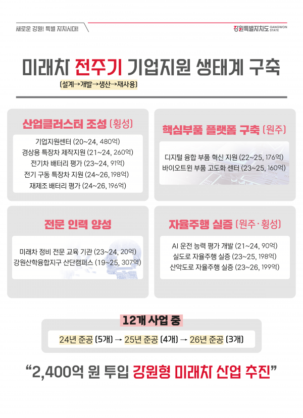 강원형 미래차 산업은 4대 전략 총 12개 세부사업으로 24년 5개 사업 준공을 시작으로 26년까지 준공이 완료되면 설계 → 개발 → 생산 → 재사용까지 미래 차 전주기 기업지원 생태계가 구축된다.