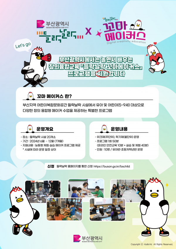 한편 어린이와 가족이 함께 미래 역량을 키우는 미래놀이터 어린이복합문화공간 '들락날락'은 부산의 16개 전 구·군으로 설치·운영이 확대되고 있다.