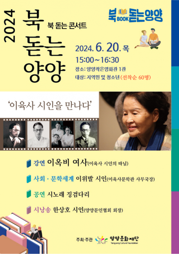 [아시아월드뉴스] 양양문화재단에서는 인문학적 가치의 확산과 독서 문화를 통한 문화공동체 형성을 위해 연중 시행하는 “북 돋는 양양” 사업의 일환으로 독립운동가이자 시인인 육사 이원록 선생을 기리는 북 돋는 콘서트를 6월 20일 오후 3시 양양작은영화관에서 연다.