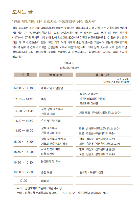 삼척시가 주최하고 강원대학교가 주관하는 이번 학술대회는 삼척 죽서루의 국보 승격을 기념해 국보 승격의 가치를 재조명하고 활용방안을 모색하기 위해 마련됐다.