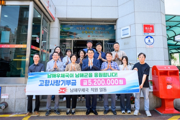 황미숙 남해우체국장은 “남해군과의 상생협력으로 지역사회에 보탬이 되고자 직원 모두 한마음을 모아 기부에 동참하게 됐다”며 “앞으로도 남해우체국에서는 지역 주민과 상생할 수 있는 다양한 활동을 지속적으로 추진할 계획이다”고 말했다.