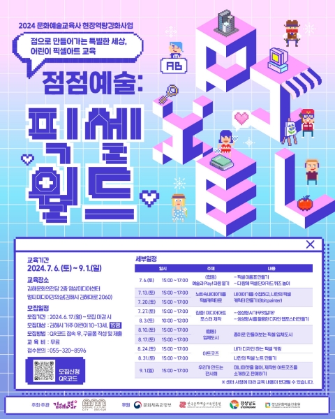 [아시아월드뉴스] 김해문화재단 영상미디어센터가 김해시 거주 어린이 대상 문화예술 무료교육 ‘점점예술:픽셀월드’의 참가자 15명을 6월 17일부터 선착순 모집한다.