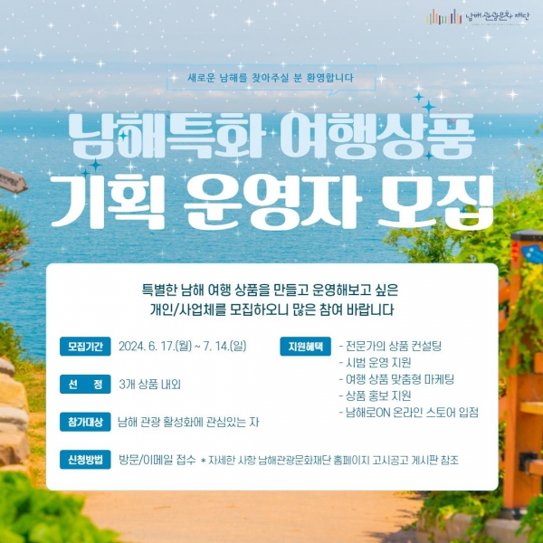 남해관광문화재단은 남해 지역관광 매력 요소를 활용한 혁신적이고 창의적인 관광 상품 아이템을 보유한 개인, 기업, 창업자들을 모집한다고 밝혔다.