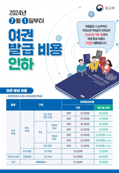 [아시아월드뉴스] 거창군은 오는 7월 1일부터 ‘한국국제교류재단법 시행령’ 개정에 따라 여권 발급 시 납부하던 국제교류기여금이 3,000원 인하되어 10년 복수여권은 26면 기준 47,000원, 5년 복수여권은 26면 기준 39,000원으로 인하된다고 밝혔다.