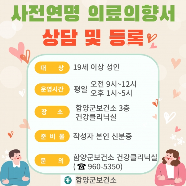 함양군 관내 등록기관은 함양군보건소, 국민건강보험공단 함양지사로 사전연명의료의향서 작성은 신분증을 지참하고 등록기관을 직접 방문해 신청하면 된다.