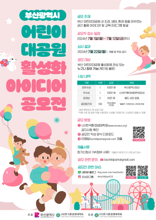 이번 공모전은 시민이 공감하고 체감할 수 있는 어린이대공원 환경 조성을 위해 시민들의 다양하고 참신한 아이디어를 모집하고 이를 실제 어린이대공원 활성화 계획에 반영하기 위해 마련됐다.