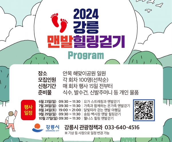 2024 강릉 맨발 힐링걷기 프로그램’은 10월까지 매월 1회 운영하고 강릉시 누리집을 통해 매 회차 행사 15일 전부터 신청할 수 있으며 회차당 각 100명 선착순으로 모집한다.