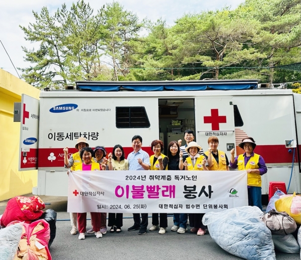 이날 적십자봉사회 10여명의 회원들은 법수면 독거노인 15세대의 이불 등을 이동 세탁 차량을 이용해 깨끗하게 세탁·건조한 후 해당 가구에 다시 돌려줬다.