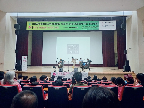 [아시아월드뉴스] 거제시학교밖청소년지원센터는 지난 25일 학교 밖 청소년 및 관련기관 청소년, 시민 등 146명이 참석한 가운데 ‘누구나 자신만의 악기가 있다’ 주제로 바디커버션 퍼포먼스 공연을 개최했다.