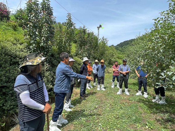 이날 현장토론회에서는 각 농가의 사과 생육 상황, 재배 기술, 병해충 방제법 등 나만의 노하우 발표와 농가별 의견을 공유하는 토론이 진행됐다.
