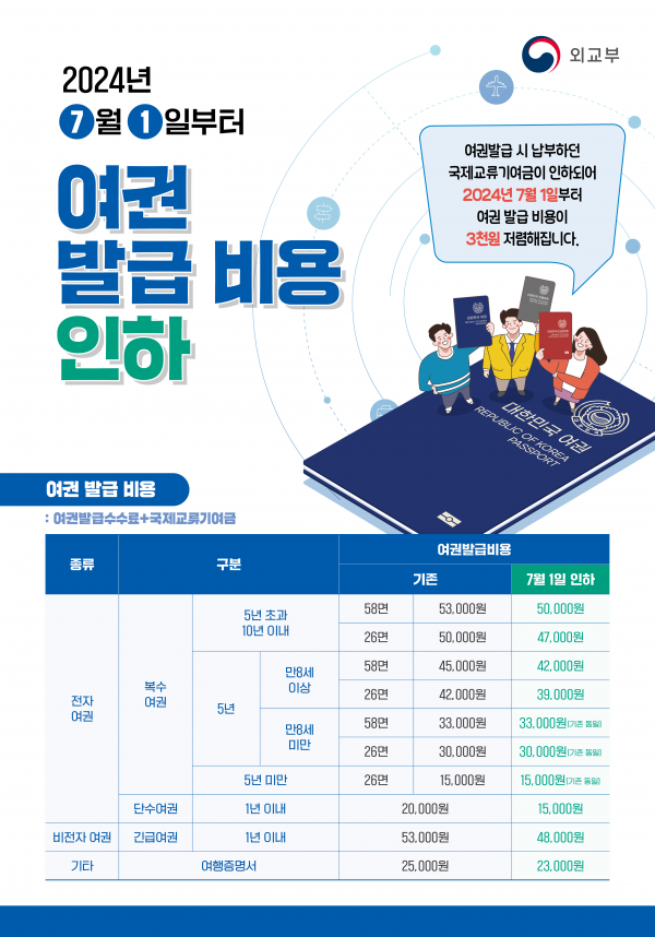 오는 7월 1일부터 한국국제교류재단법 시행령 개정으로 여권 발급 시 수수료와 함께 납부하던 국제교류기여금이 인하됨에 따라 기존 53,000원이었던 복수 26면 전자여권은 50,000원으로 50,000원이었던 복수 26면 전자여권은 47,000원에 발급받을 수 있게 된다.