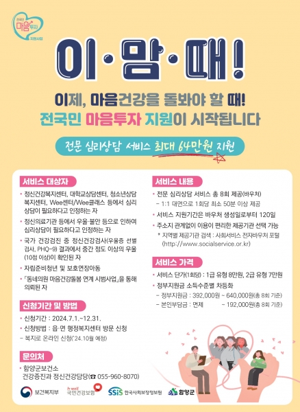 올해 처음 추진하는 ‘전국민 마음투자 지원사업’은 우울·불안 등으로 도움이 필요한 사람에게 일대일 심리상담을 받을 수 있는 바우처를 제공하는 전문적인 심리상담 서비스로 군민의 마음 건강을 돌보는 사업이다.
