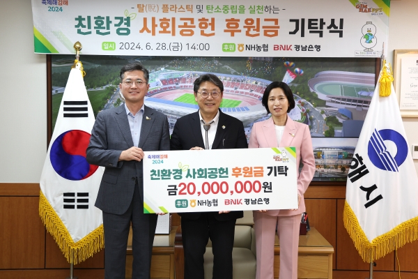 시는 NH농협은행과 BNK경남은행이 친환경사회공헌 기부에 3년 연속 동참하도록 이끌고 28일 두 은행과 1회용품 폐기물 발생저감 및 탈 플라스틱 사회로의 전환을 위한 탄소중립 시책 추진에 동참하는 의미로 2천만원을 기탁했다.
